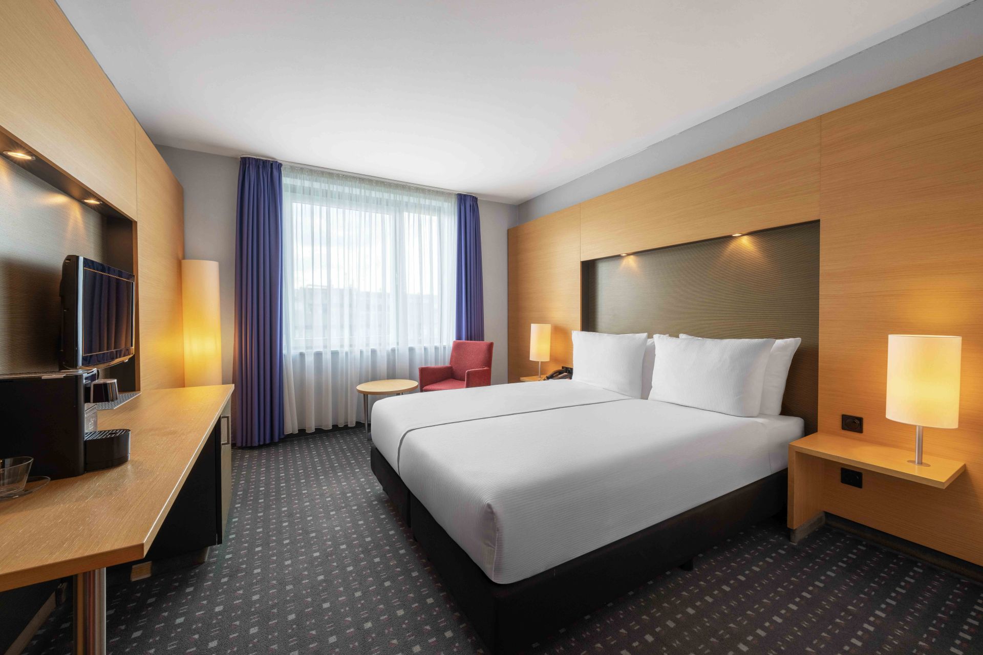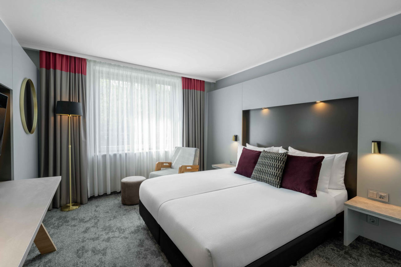 Our Deluxe Double Rooms with air conditioning and calm location convince you with all amenities for your stay on 18 sqm. All rooms have free WiFi, a bottle of water on arrival, desk, sitting area, flatscreen TV and a private bathroom with complimentary toiletries. Connecting rooms and accessible rooms are also available in this category.